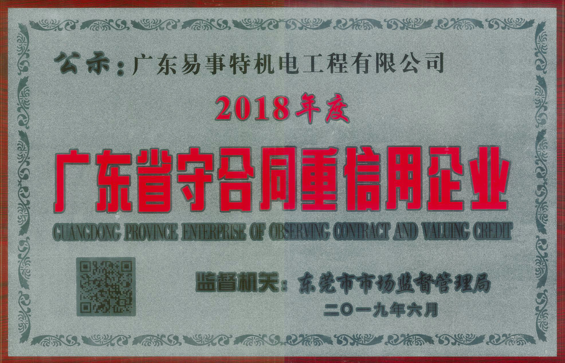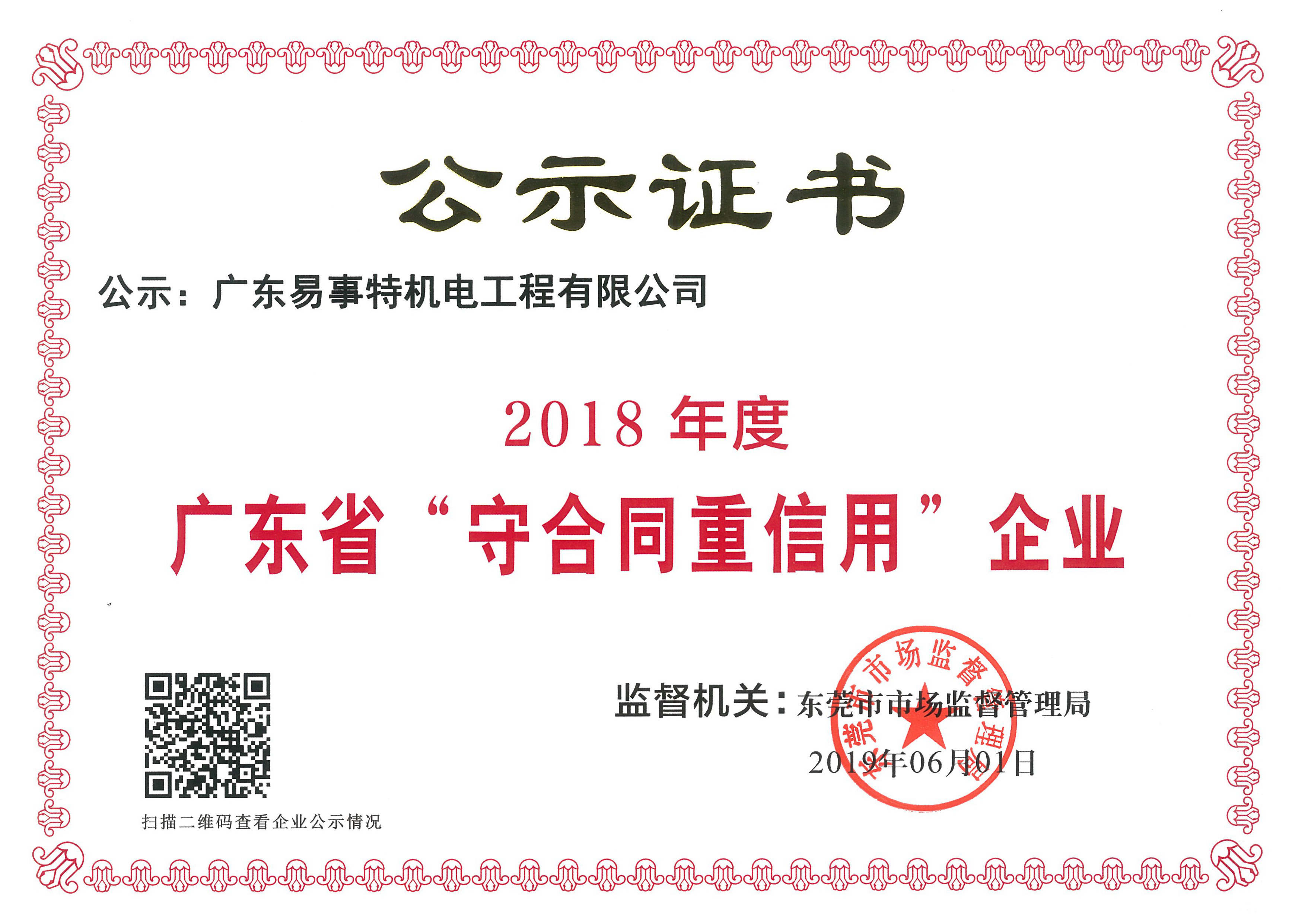 201961日,廣東易事特機電工程有限公司被東莞市市場監督管理局授予 “2018年度廣東省重合同守信用企業”榮譽稱號,預示著易事特機電在走向市場經濟規范化,提高企業守法經營能力,塑造企業良好信譽形象又邁上了一個新臺階。